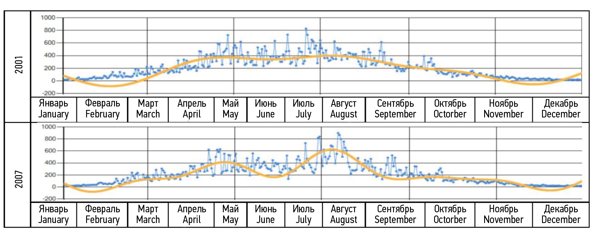 Fig. 1. Circannual changes in solar radiation in Khanty-Mansiysk in 2001 and 2007: X-axis, months; Y-axis, solar radiation intensity (W/m2).