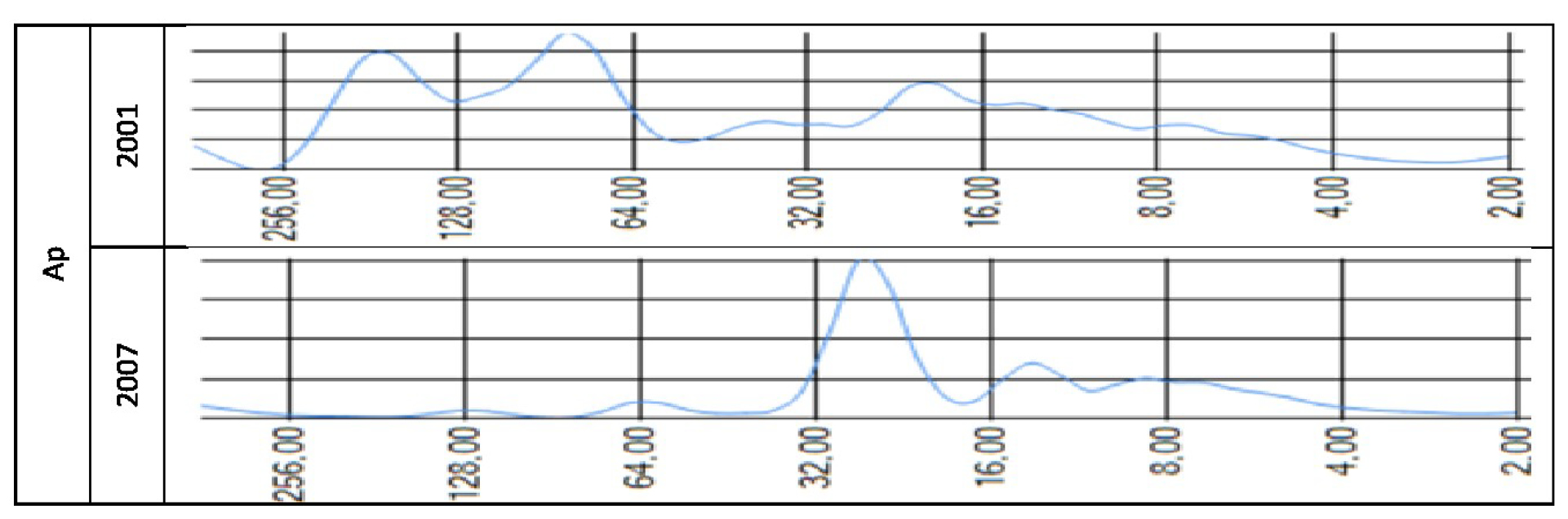 Fig. 3. Circannual rhythms of the planetary magnetic index Ap in years of high (2001) and low (2007) solar activity: X-axis, rhythm amplitude (conventional units); Y-axis, rhythm periods (days).