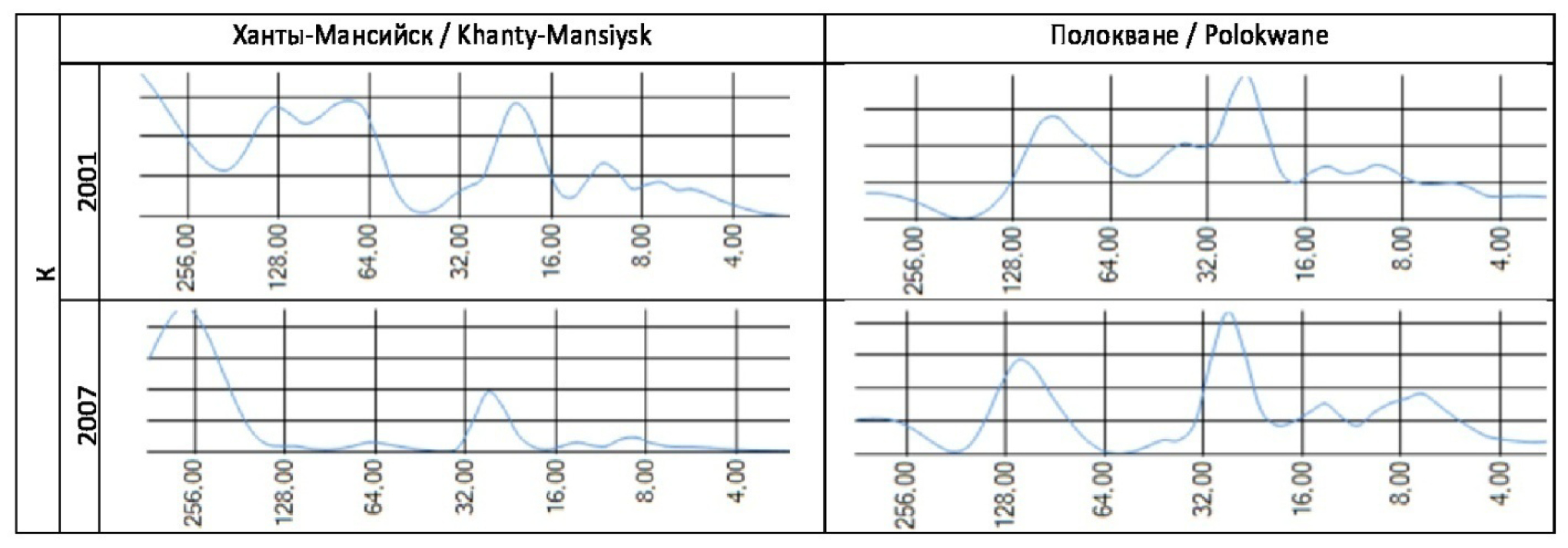 Fig. 4. Circannual rhythms of the local geomagnetic index K in Khanty-Mansiysk and Polokwane in years of high (2001) and low (2007) solar activity: X-axis, rhythm amplitude (conventional units); Y-axis, rhythm periods (days).
