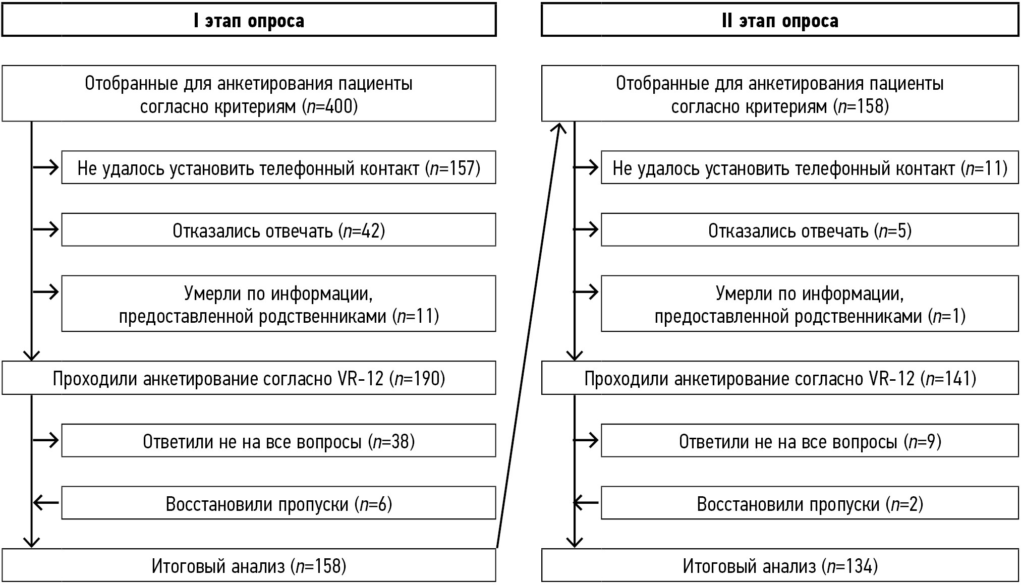 - пациенты, отказавшиеся отвечать на вопросы анкеты VR-12 на II этапе опроса.