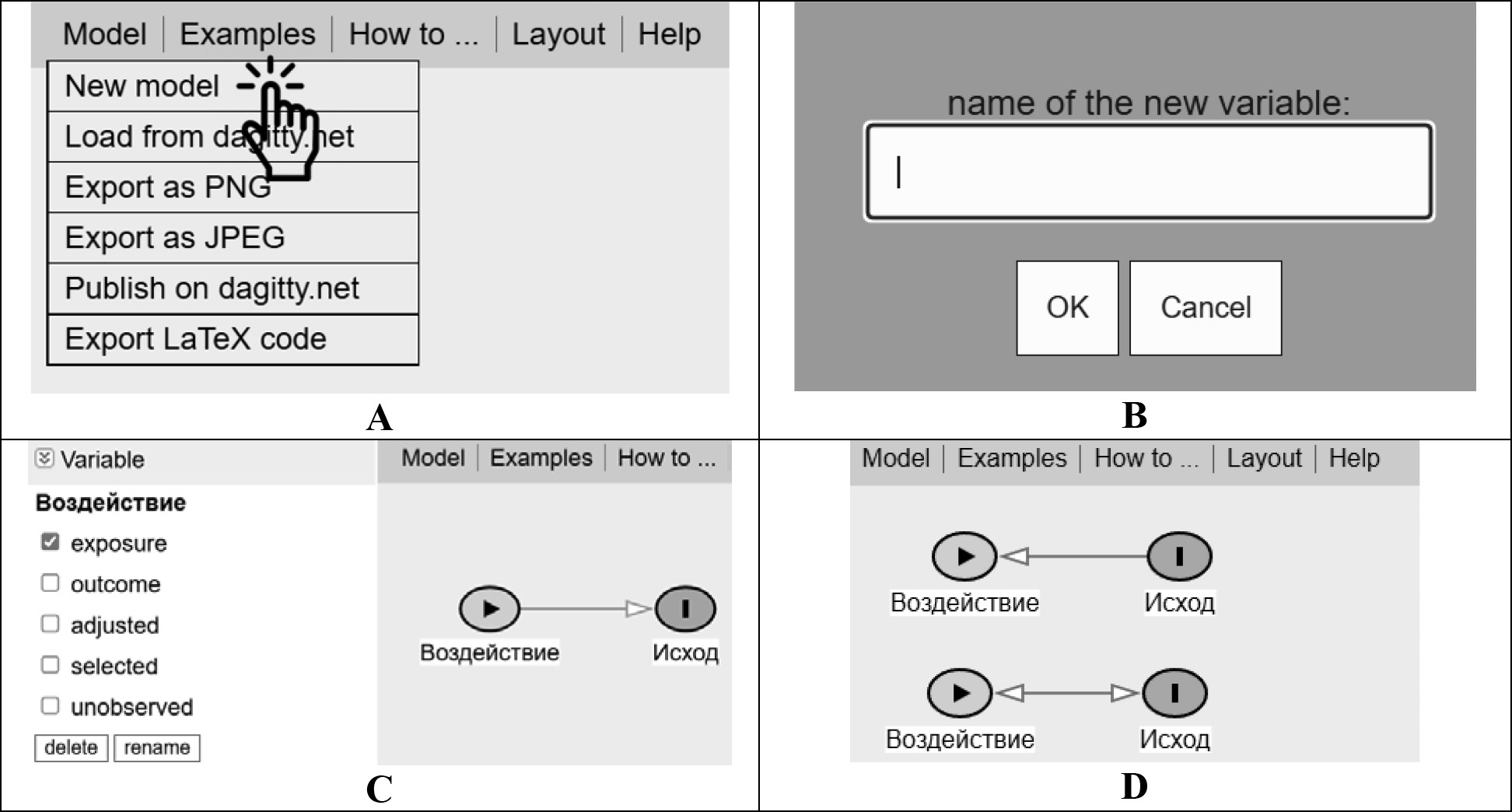Перевод интерфейса программы: А — New model (новая модель), Load from daggity.net (загрузить из daggity.net), Export as PNG (экспортировать/скачать в формате PNG), Export as JPEG (экспортировать/скачать в формате JPEG), Publish on daggity.net (публиковать в daggity.net), Export LaTeX code (экспортировать/скачать LaTeX код); В — name of the new variable (название новой переменной), OK (да/принять), Сancel (отмена); С — Variable (Переменная), exposure (воздействие), outcome (исход), adjusted (скорректировано), selected (выбрано), unobserved (не наблюдается/нет данных).