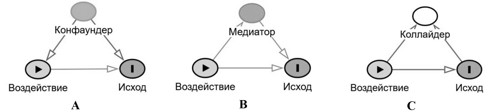 Особое значение отводится определению роли факторов (переменных) по отношению к воздействию и исходу для выявления факторов, учитывать которые необходимо, и факторов, коррекция на которые может привести к искажению изучаемой связи. На рис. 3 показаны основные компоненты DAGs и роли факторов (переменных), определяемые в контексте изучения (причинно-следственной) связи между воздействием и исходом. В терминологии DAGs факторы, влияющие на связь между воздействием и исходом, классифицируются как конфаундеры (сonfounders; рис. 3A), медиаторы/модификаторы эффекта (mediators/effect modifiers; рис. 3B) и коллайдеры (colliders; рис. 3C).