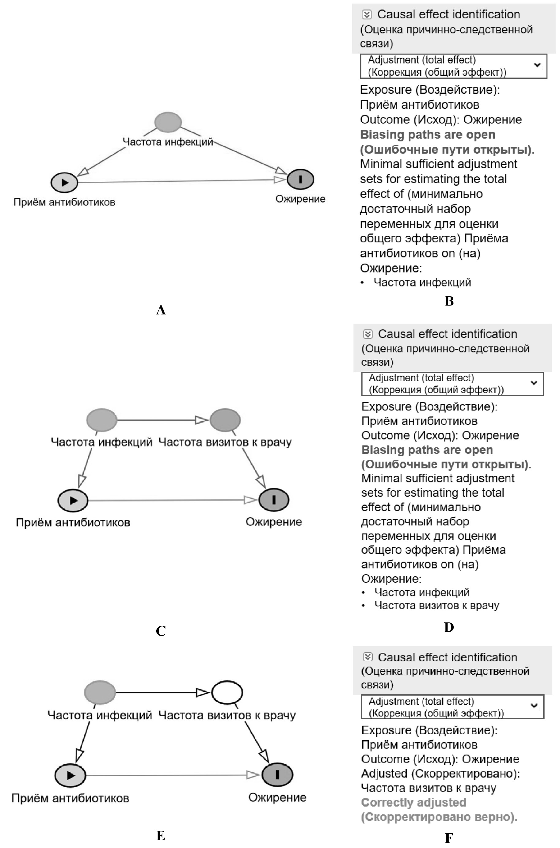 DAGs, построенный по заданным в вышеупомянутом примере условиям, представлен на рис. 4А. В верхней правой части рабочей области интерфейса DAGitty находится вкладка «Causal effect identification» (Оценка причинно-следственной связи), где указывается минимально достаточный набор переменных (Minimal sufficient adjustment sets) для коррекции при оценке общего эффекта (влияния; total effect) воздействия на исход (рис. 4В). В приведённом примере для корректной оценки связи между приёмом антибиотиков и развитием ожирения необходима коррекция на частоту инфекций. Иногда переменную-конфаундер сложно измерить объективно, например, если невозможно оценить количество перенесённых инфекций, коррекция может быть проведена с учётом количества визитов к врачу (прокси-конфаундер), что косвенно может отражать частоту инфекций (рис. 4C). Построив DAGs с учётом прокси-конфаундера, мы видим, что коррекция может быть проведена на конфаундер или прокси-конфаундер (рис. 4D). Коррекция на оба фактора будет избыточной. На рис. 4E проведена коррекция на прокси-конфаундер. При этом красные стрелки стали чёрными, что значит, что ошибочные (смещённые) пути, проходящие через конфаундер, закрыты. Во вкладке «Causal effect identification» (Оценка причинно-следственной связи) программа сообщает нам, что коррекция проведена верно (рис. 4F).