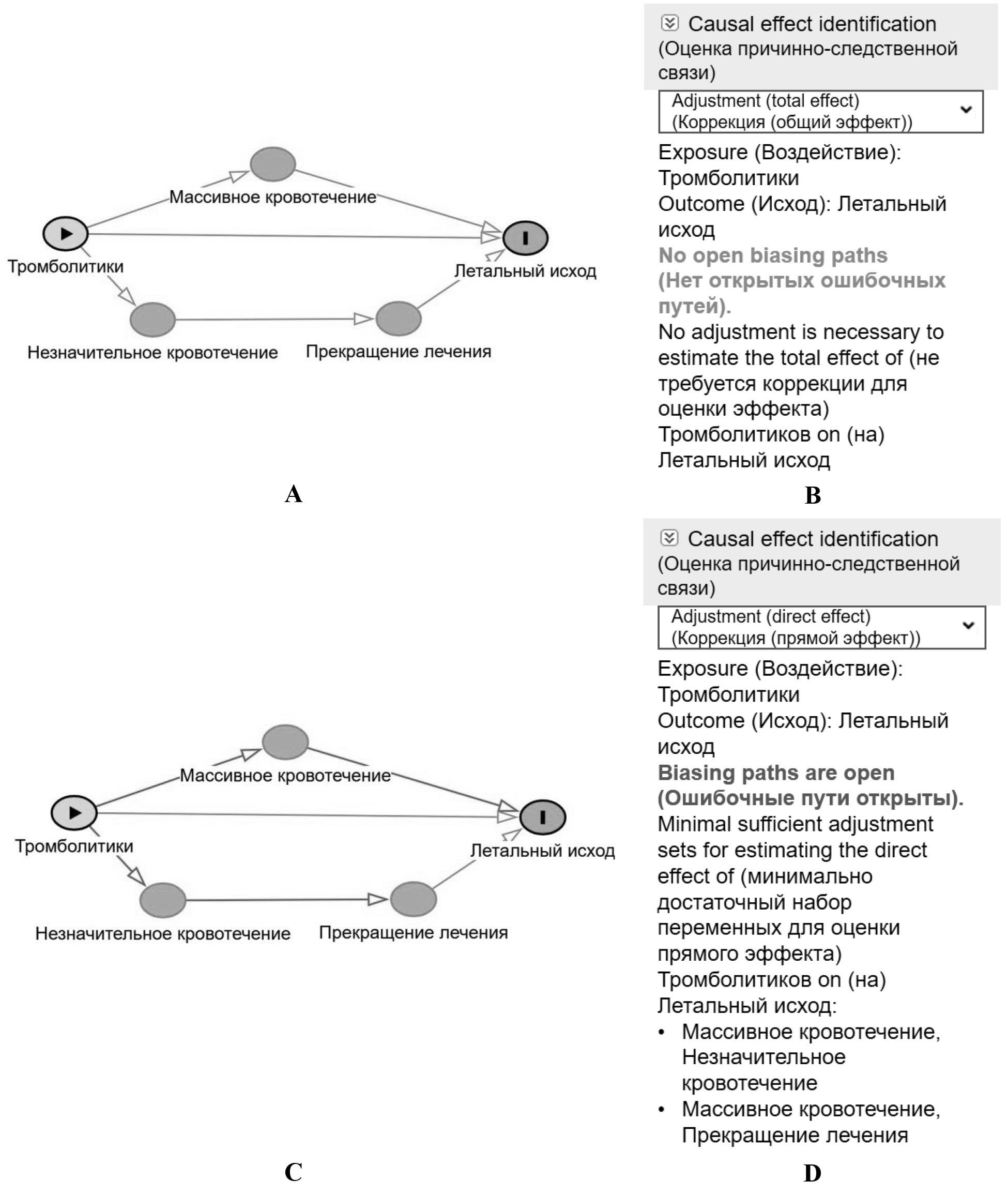 При выборе варианта эффекта — общий эффект (total effect) или прямой эффект (direct effect) — с использованием вкладки «Causal effect identification» (Оценка причинно-следственной связи) в верхней правой части рабочей области DAGgitty программа сообщает о необходимости коррекции. В нашем примере для оценки общего эффекта воздействия на исход не требуется проведения коррекции на медиаторы (рис. 5B). Однако если для исследователя представляет интерес оценка прямого эффекта препарата, не связанная с возникновением кровотечения, потребуется учёт влияния (коррекция) медиаторов (рис. 5С, 5D). При этом программа предлагает два варианта коррекции: в первом учитываются переменные «массивное кровотечение» и «незначительное кровотечение», во втором — «массивное кровотечение» и «прекращение лечения». Коррекция с учётом всех трёх переменных будет избыточной, что может неоправданно занижать мощность исследования.