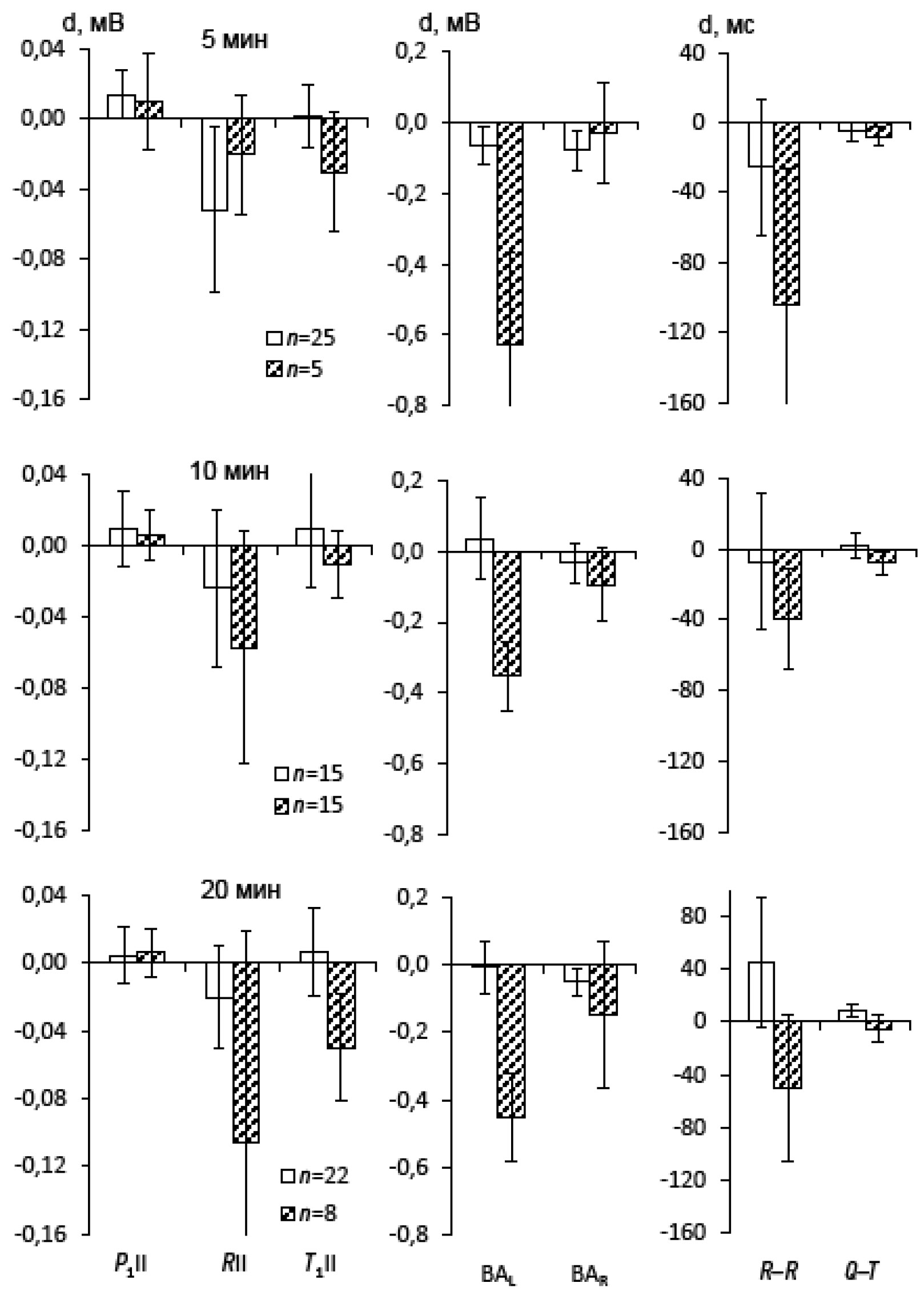 На 20-й минуте средней ОГ соотношение количества лиц в подгруппах изменилось: в 1-м кластере — 31%, а во 2-м — 69% от выборки. В этот период у лиц из 1-го кластера существенно уменьшались зубцы RII (р=0,010), T1II (р <0,001), суммарная BAR (р=0,020), интервал R–R (р=0,017) (см. рис. 2). Во 2-м кластере к таким же изменениям дополнились с высокой статистической значимостью уменьшения суммарной BAL (р <0,001) и интервала Q–T (р=0,005). Минутный объём кровообращения прирастал в 1-м кластере на 11,80±3,91 мл/кг · мин–1 (р=0,016), а во 2-м кластере — на 8,40±2,70 мл/кг · мин–1 (р=0,034). Всё это происходило на фоне статистически значимого ещё большего уменьшения SрO2 (р <0,001) у лиц 1-го (20,0±2,04%) и 2-го (19,6±1,08%) кластеров.