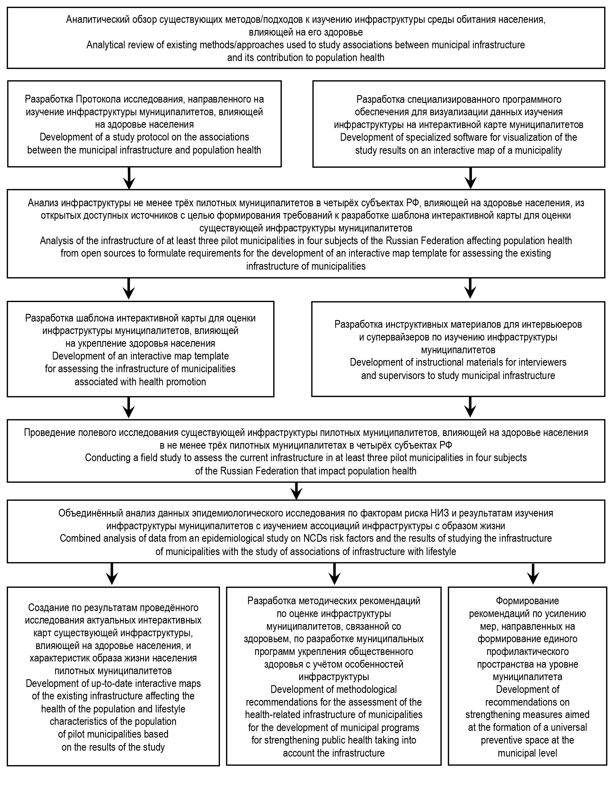 Цели исследования. Создание модели комплексной оценки фактического состояния инфраструктуры муниципалитета, влияющей на здоровье, и анализ ассоциации инфраструктуры с образом жизни населения, а также формирование единого профилактического пространства на уровне муниципалитета/субъекта и разработка комплексной межсекторальной программы укрепления здоровья с учётом факторов риска здоровью населения на конкретной территории (муниципалитете/субъекте).