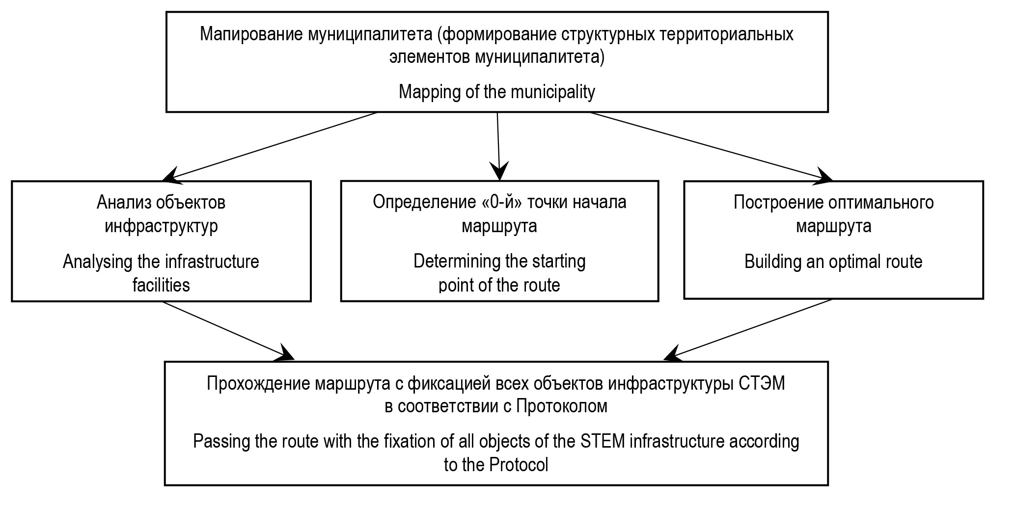 Основные этапы исследования включают обход выбранной территории СТЭМ по заданному маршруту и фотофиксацию всех инфраструктурных объектов, подлежащих изучению согласно разработанной инструкции. По окончании рабочего дня после завершения обхода территорий исследователи сдают свои ежедневные маршрутные листы обхода СТЭМ супервайзеру, делают отметку о выполнении задания в своём индивидуальном плане и получают маршрутные листы обхода территории СТЭМ на следующий день.