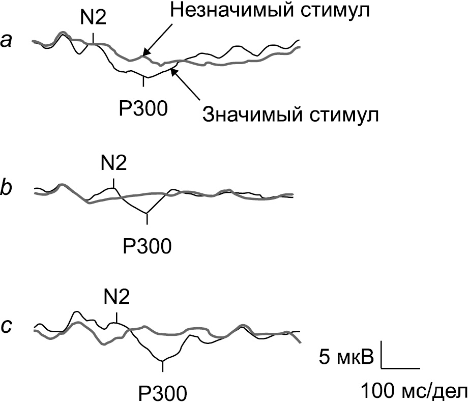 Рис. 1. Пример слуховых потенциалов, связанных с событиями р300, зарегистрированных в центральной области мозга: а — испытуемая А. из группы с минимальным риском ИЗ (ЛВ N2=184 мс, ЛВ Р300=284 мс, амплитуда — 11 мкВ); b — испытуемая В. из группы со склонностью к ИЗ (ЛВ N2=205 мс, ЛВ Р300=297 мс, амплитуда — 10 мкВ); c — испытуемая М. из группы с интернет-зависимостью (ЛВ N2=210 мс, ЛВ Р300=315 мс, амплитуда — 12 мкВ).