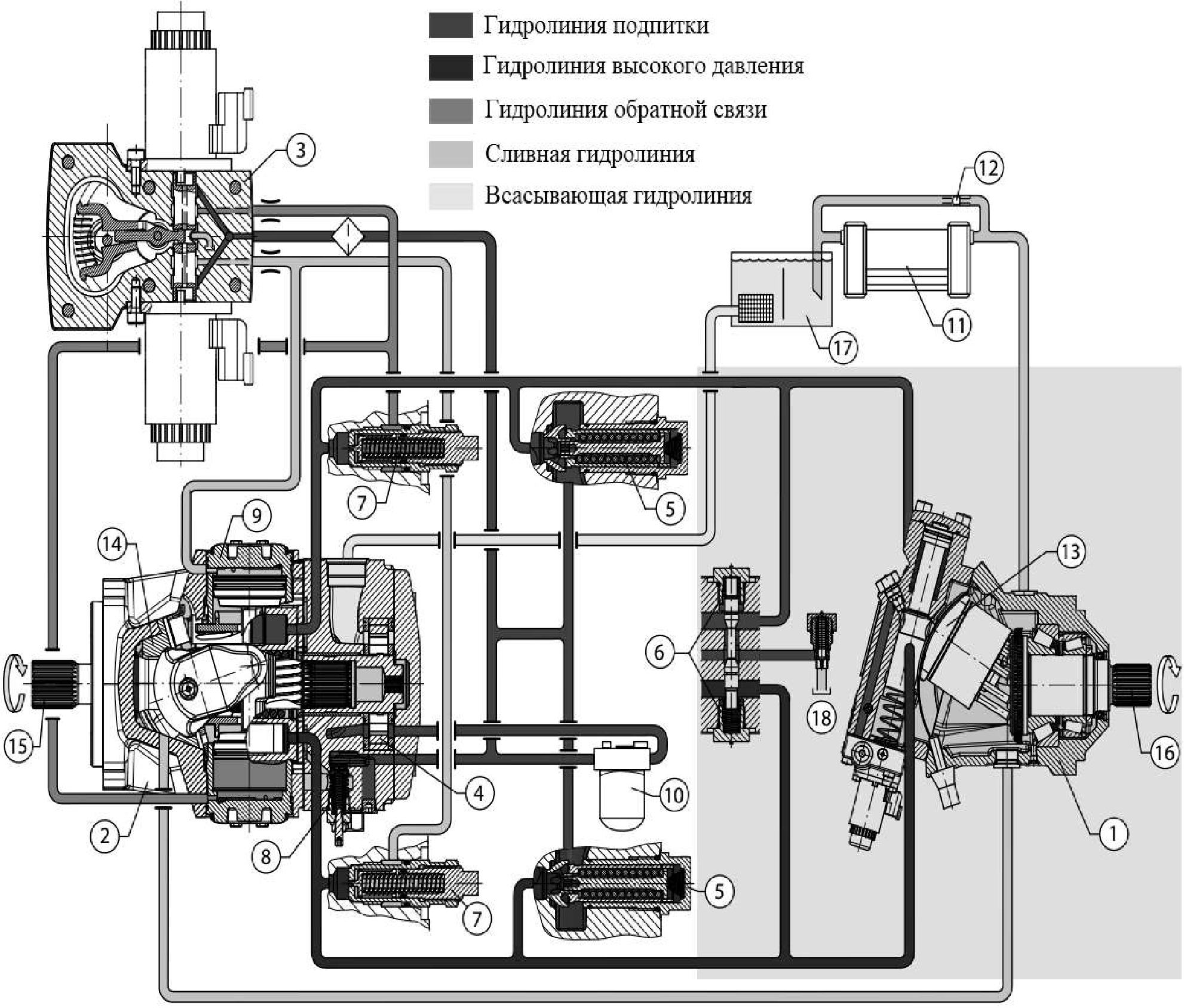 Рис. 1. Схема гидрообъемной передачи: 1 – гидромотор с изменяемым объемом, 2 – гидронасос с изменяемым объемом, 3 – электромеханический узел регулирования объема гидронасоса, 4 – подкачивающий насос, 5 – клапана подкачки, 6 – золотник промывки, 7 – предохранительные клапана, 8 – клапан ограничения давления подпитки, 9 – сервоцилиндр, 10 – фильтр, 11 – радиатор, 12 – термостат, 13 – блок цилиндров гидромотора, 14 – наклонная шайба гидронасоса, 15 – входной вал, 16 – выходной вал, 17 – гидробак, 18 – гидролиния в корпус мотора