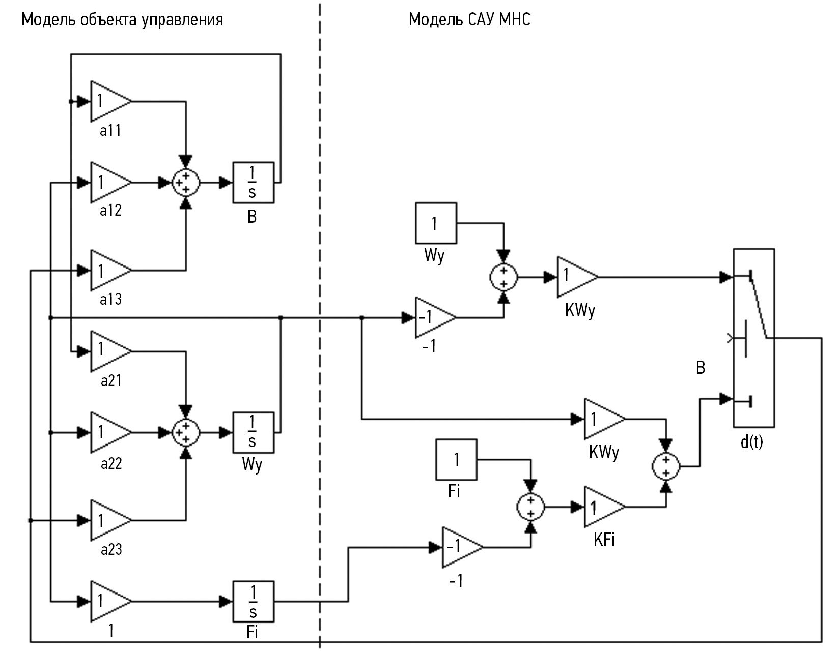 Для начала исследования системы управления движением БК требуется указать линейные функции управления БК (табл. 1). Затем на основе полученных расчетов нужно построить структурную схему моделирования управляемого движения БК с использованием линейных функций (рис. 4).