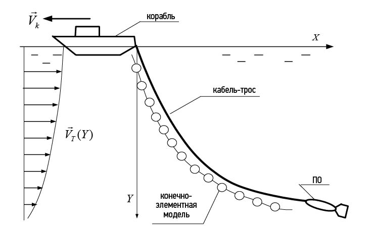 Корабль буксирует подводный объект (ПО) заданной формы и отрицательной плавучести p0 на гибком кабель-тросе. Заданы характеристики кабель-троса: длина кабель-троса L, диаметр d*, отрицательная плавучесть погонного метра p*. Буксировка осуществляется по прямой с постоянной скоростью Vk. Требуется определить конфигурацию кабель-троса и положение (ПО) по отношению к кораблю (рис. 1). Профиль течения (функция VT(Y)) и скорость буксировки Vk известны.