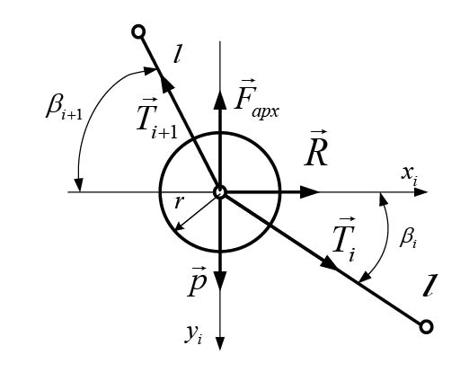 Дополним математическую модель задачи уравнениями равновесия каждого сферического элемента кабель-троса (рис. 3):