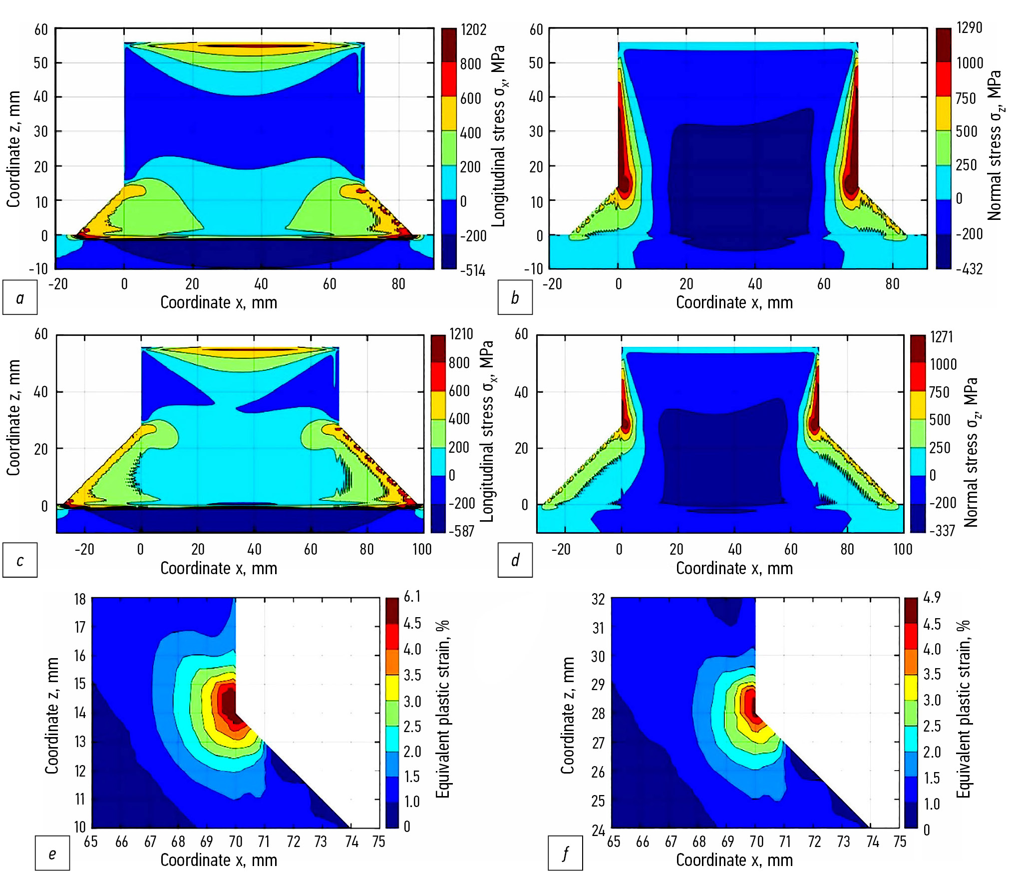 Добавление на торцах плоских галтелей не приводит к существенному изменению характера распределения продольных напряжений, как видно на рис. 4, а, c. Можно отметить уменьшение областей, в которых растягивающие напряжения σx превышают предел текучести. Вблизи поверхности галтелей формируются области растягивающих напряжений σx, не превышающих 600 МПа. Наибольшее изменение претерпевает распределение нормальных напряжений. Как видно из рис. 4, b, d, области концентрации растягивающих напряжений σz на торцах наплавки отдаляются от подложки на величину равную катету галтели. Причем чем больше величина катета, тем меньше размеры этих областей. Наличие галтелей оказывает незначительное влияние на величину накопленных пластических деформаций (рис. 4, e, f). Увеличение катета в 2 раза приводит к снижению пластических деформаций на 20%, а по сравнению с прямой стенкой — лишь на 30%. Удаление областей концентрации напряжений и деформаций от подложки должно оказать положительный эффект на пластичность наплавляемого металла за счет более плавного охлаждения. Недостатком данного конструктивного решения является необходимость наплавки значительного объема дополнительного металла.