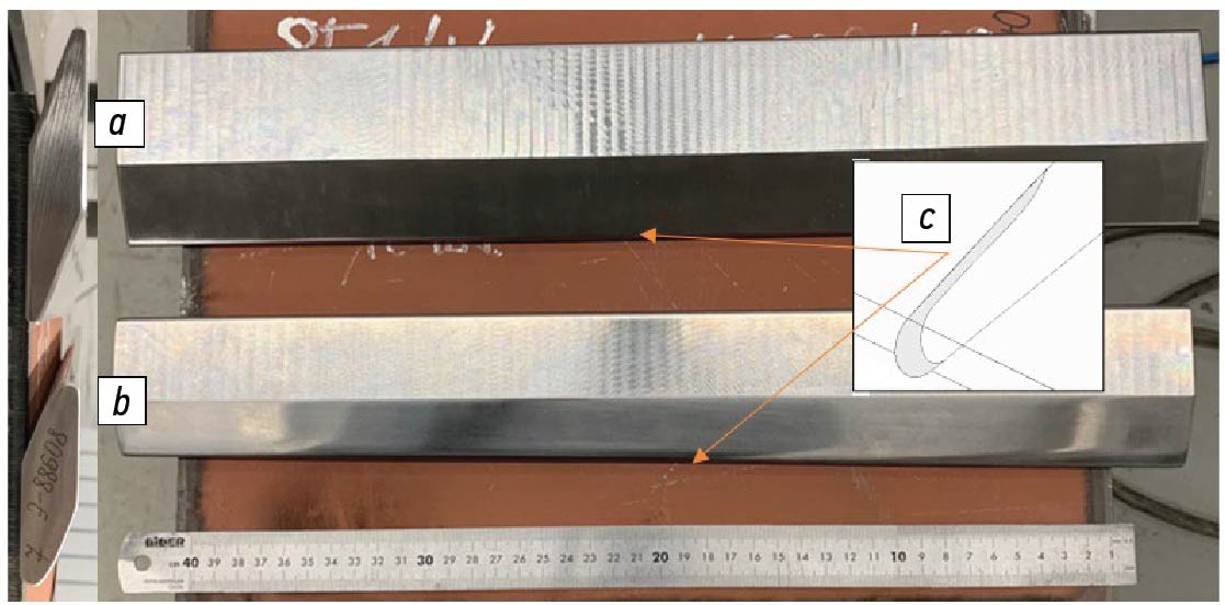 Для экспериментальных исследований лазерно-индукционного термоупрочнения использованы плоские образцы постоянного сечения размерами 460×80×16,5 мм и переменного сечения размерами 450×60/70×16,8 мм из жаропрочных сталей 15Х11МФ, 20Х13, ЭИ-961 (рис. 2). Химический состав сталей представлен в табл. 1. Целью исследований было получение единой зоны упрочнения на входной кромке и примыкающем участке спинки образцов (рис. 2, c) без дефектов в виде микротрещин и несплошностей, без оплавления поверхности, оценка твердости в границах упрочненного слоя, а также глубины упрочненного слоя в области входной кромки и на примыкающем участке спинки.