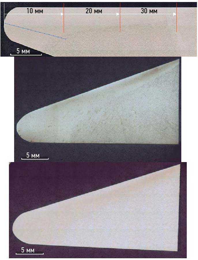 Рис. 7. Внешний вид упрочненной зоны поверхности переменного сечения образца 15Х11МФ: верх — после закалки; середина — после механической зачистки абразивной бумагой; низ — макрошлифы упрочненной зоны входной кромки.