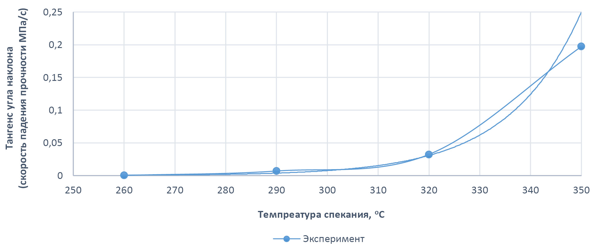 Для построения математической модели процесса падения прочности, как и в случае ее роста, необходимо определить зависимость тангенса угла наклона прямой (скорости падения прочности) от температуры спекания. Остается вопрос, как объяснить, предел прочности при температуре 200°С падает больше, чем при температуре 230°С. Необходимо более тщательно проанализировать участок падения предела прочности.
