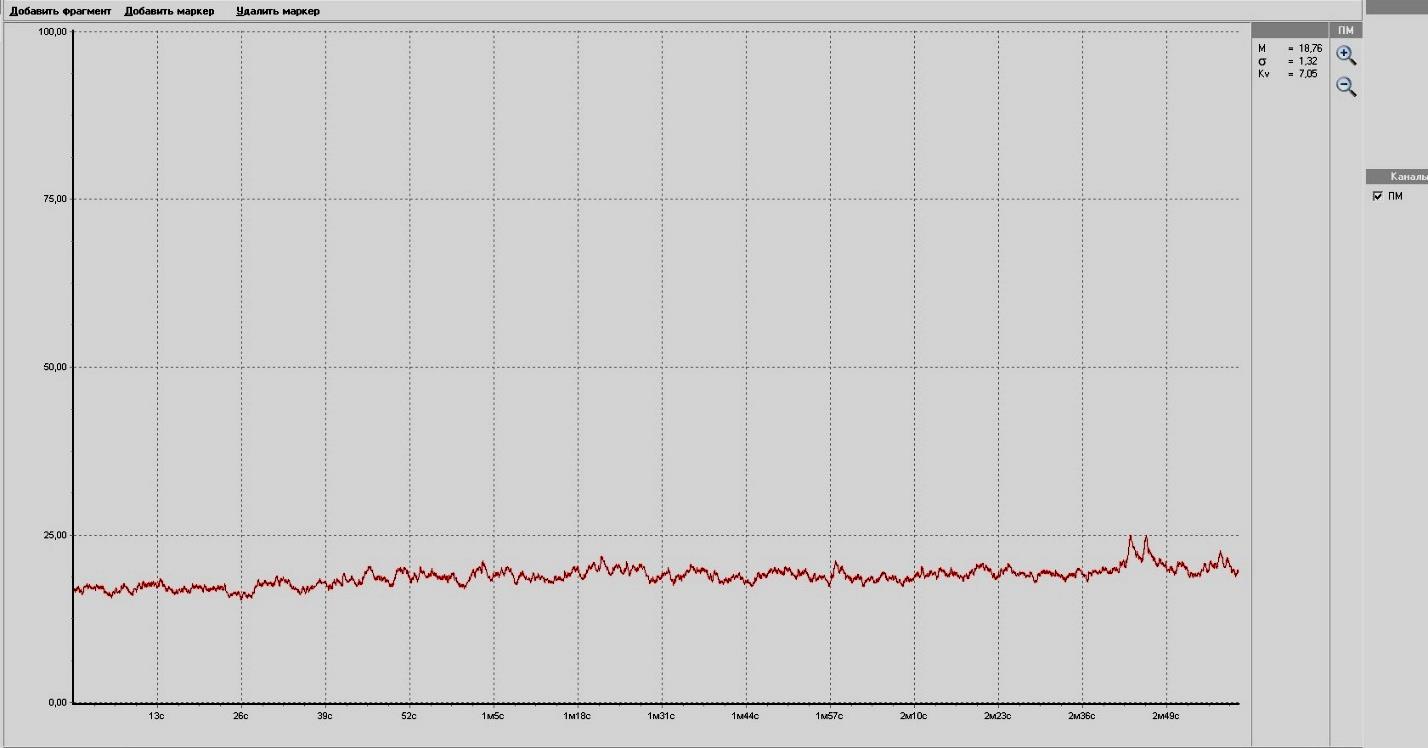 Так, параметр микроциркуляции составил (19,83 ± 1,3) пф. ед., средняя скорость кровотока – (2,81 ± 0,1) пф. ед., коэффициент вариации статистически значимо уменьшился в 2,5 раза и составил (14,18 ± 1,2) %, при р < 0,05. Данные показатели свидетельствуют о появлении спазмированного участка в мышечной ткани, значительном затруднеии локального кровотока (рис. 6).