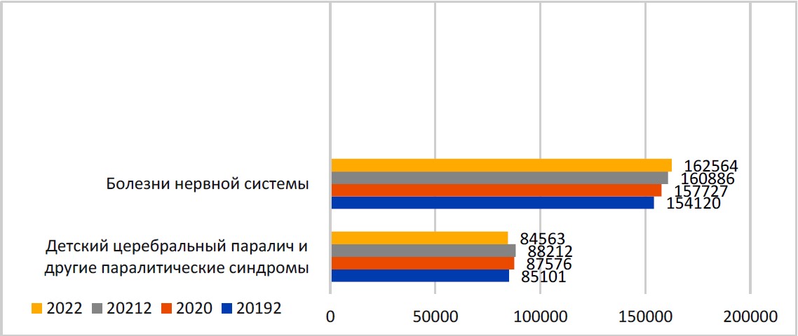 Таким образом, дети-инвалиды, имеющие ДЦП и другие паралитические синдромы, занимали 1-е место среди заболеваний нервной системы. За период с 01.01.2019 по 01.01.2022 г. данный показатель увеличился с 85 101 до 87 576 и 88 212 детей, и темп роста за 3 года составил 3,7 %. Это можно объяснить тем, что с повышением качества оказания медицинских услуг (на этапе натального, интранатального и постнатального периодов), отмечается и рост числа детей с данной патологией.