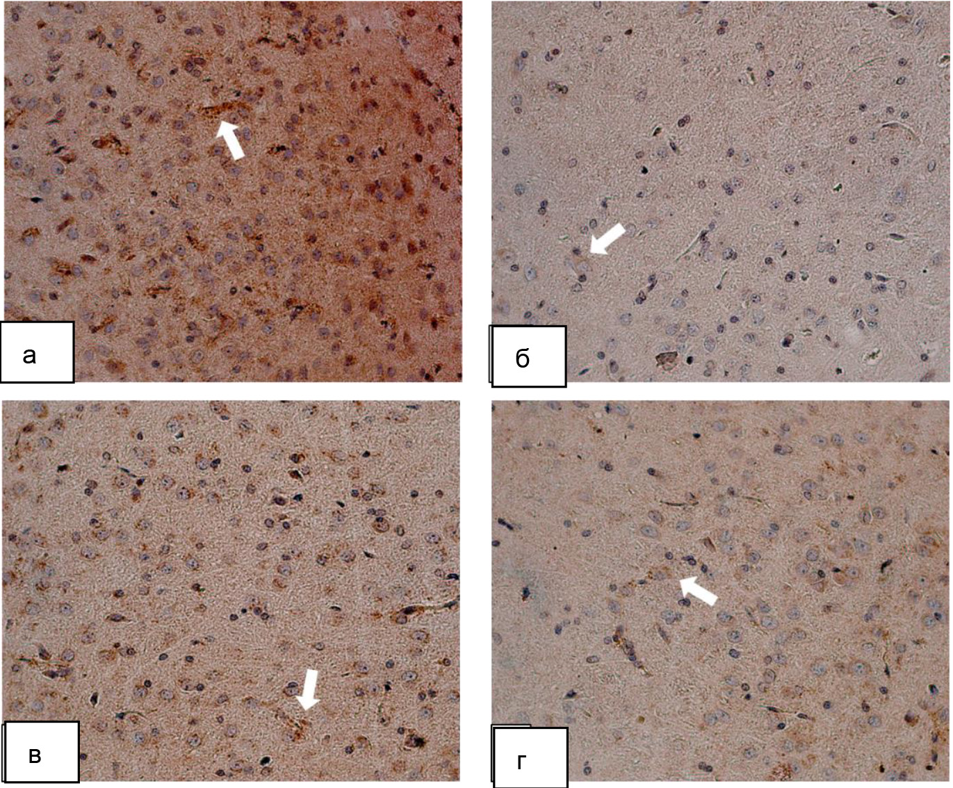 Рис. 3. Изменение экспрессии белка Klotho в цитоплазме нейронов срединных ядрах таламуса (преимущественно паравентрикулярных) крыс при экспериментальном сахарном диабете: а – группа интактных животных (крысы без СД); б – группа животных с сахарным диабетом (СД); в – группа животных с сахарным диабетом и фармакокоррекцией аминалоном (СД + аминалон); г – группа животных с сахарным диабетом и фармакокоррекцией сукцикардом (СД + сукцикард). Иммуногистохимическое исследование, антитела против белка Klotho, докраска гематоксилином. Увеличение ×400. Белые стрелки – экспрессия ИРМ