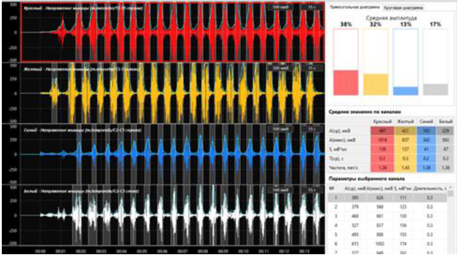 В статистическую обработку брались только количественные данные, такие как средняя амплитуда в мкВ. Соответствие нормальному распределению проверялось с помощью теста Шапиро – Уилка, так как в каждой выборке было по 40 и 37 наблюдений. Так как распределение всех показателей соответствовало нормальному, для описания использовали среднюю арифметическую и стандартное отклонение M(SD), а для сравнения показателей в основной и контрольной группах – двухвыборочный критерий Стьюдента. Все расчеты проводились с достоверностью 95 %.