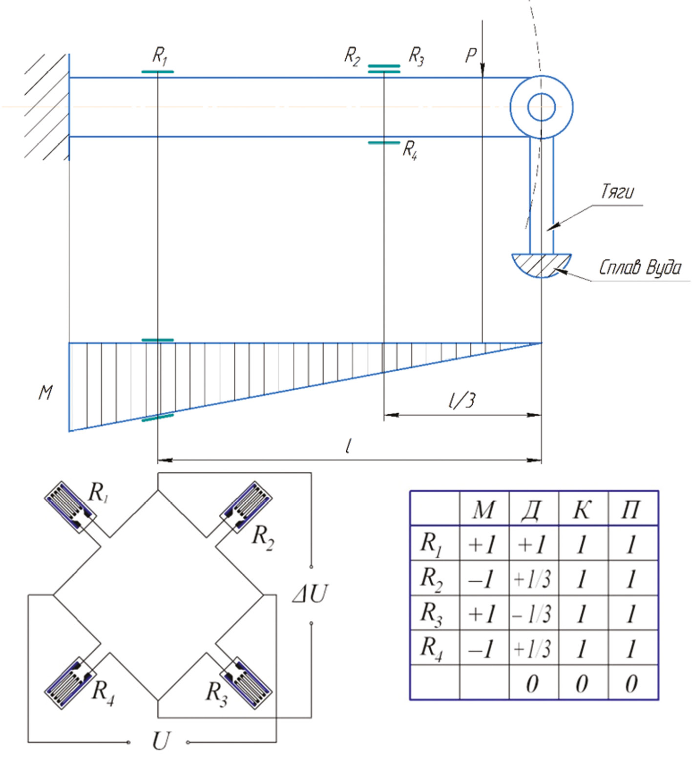На схеме можно видеть, что для трех тензорезисторов плечо в три раза меньше, а значит, изгибающий момент, напряжение и деформация также будут в три раза меньше, но используется три датчика. Поэтому сигнал одного тензорезистора R1 компенсируется сигналами от тензорезисторов R2, R3, R4.