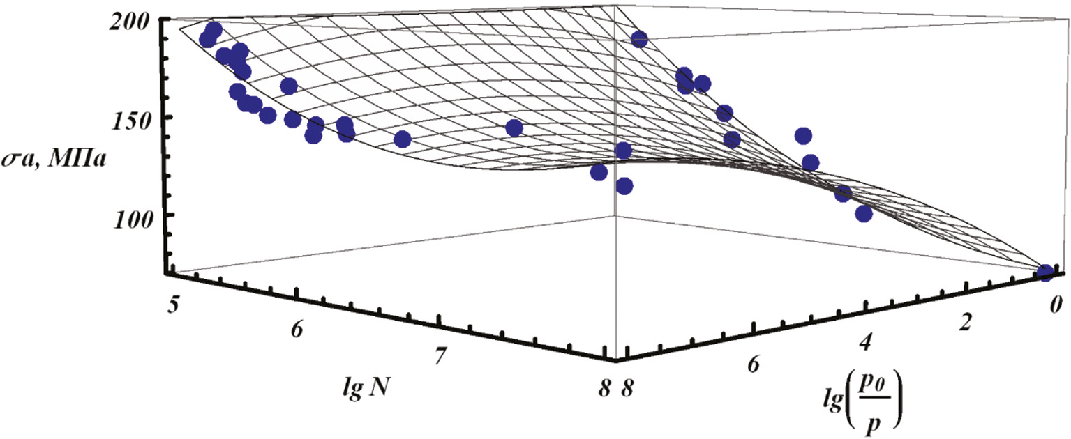 Результаты. Проведена проверка работоспособности предложенного метода, условно названного методом получения «поверхности усталости». Для анализа выбраны опытные данные источника [3], касающиеся испытаний титановых образцов, в которых в качестве фактора X принималась степень окружающего вакуума, количественно выраженная соотношением давления воздуха на уровне моря p0 к давлению окружающей объект атмосферы p. Составляющие функции в выражении (1) соответствуют поверхности, представляющей собой лоскут гиперболического параболоида (рис. 1).