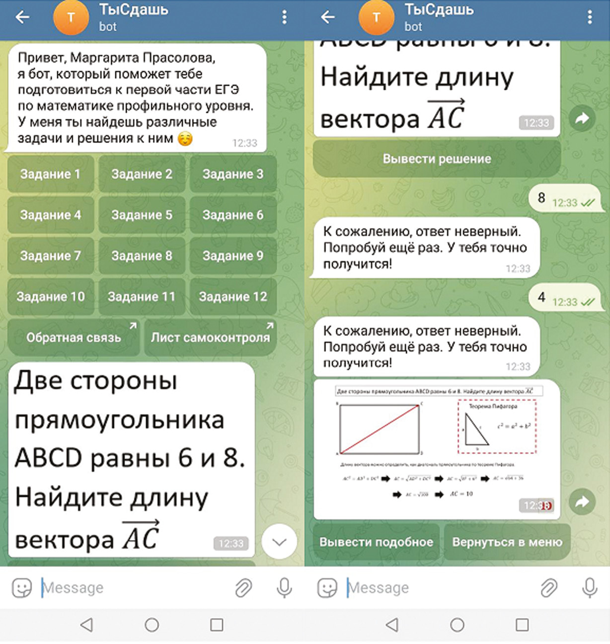Выводы. Реализовано цифровое средство подготовки старшеклассников к ЕГЭ по математике профильного уровня, которое было высоко оценено школьниками, учителями и репетиторами. В перспективах увеличение количества задач, добавление полных вариантов первой части экзамена, создание видеоразборов задач и запуск функционирования бота на базе удаленного сервера.