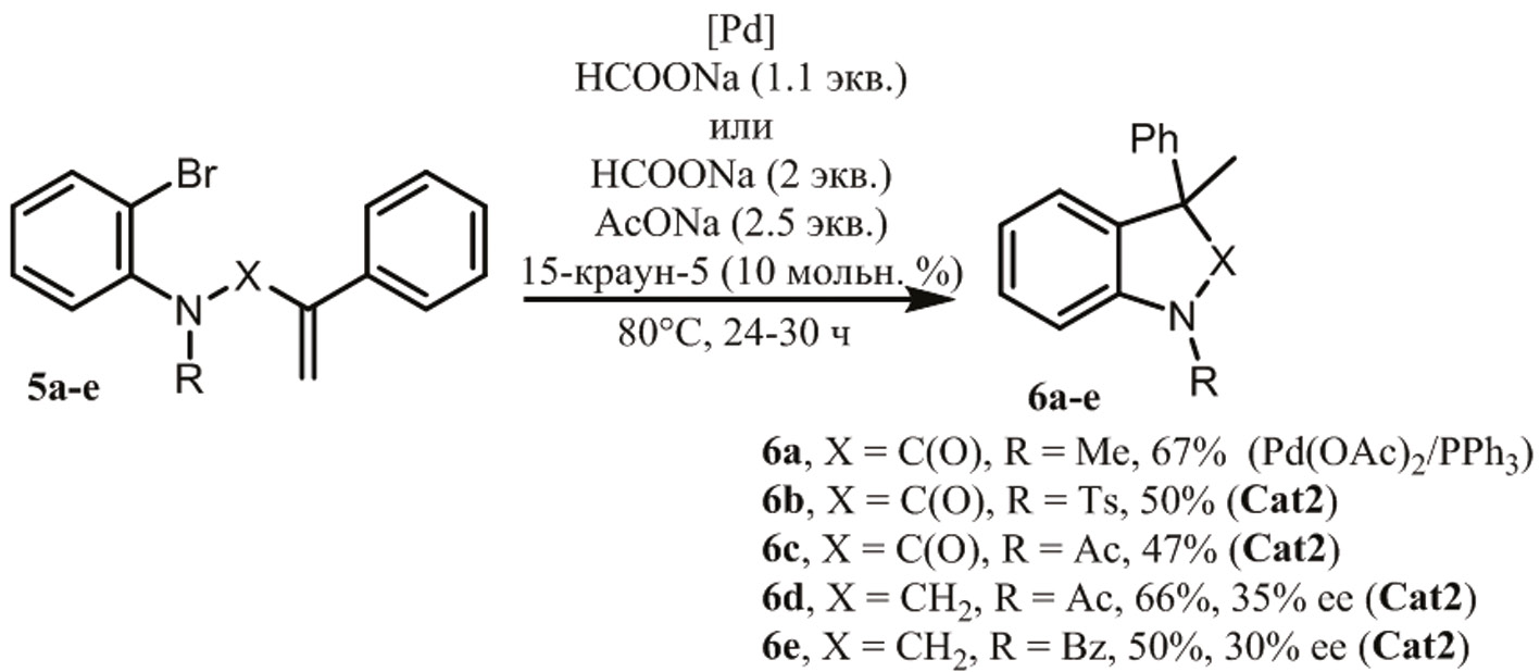 Полученные 2-фенилаллиламиды 5d,e также подвергали циклизации в условиях внутримолекулярной восстановительной реакции Хека. Фосфиновые лиганды не показали хорошей результативности в данной реакции, в то время как комплексы палладия с хиральными вицинальными диаминами Cat1–3 позволили получить индолин 6d с умеренными выходами (25–43 %). При катализе комплексом палладия с (R,R)-N,N-дибензилциклогексан-1,2-диамином Cat2 и использовании добавки 15-краун-5 удалось значительно увеличить выход индолинов 6d (66 %) и 6e (50 %). Оба продукта были получены в нерацемическом виде, с энантиомерными избытками 30–35 % (рис. 3).